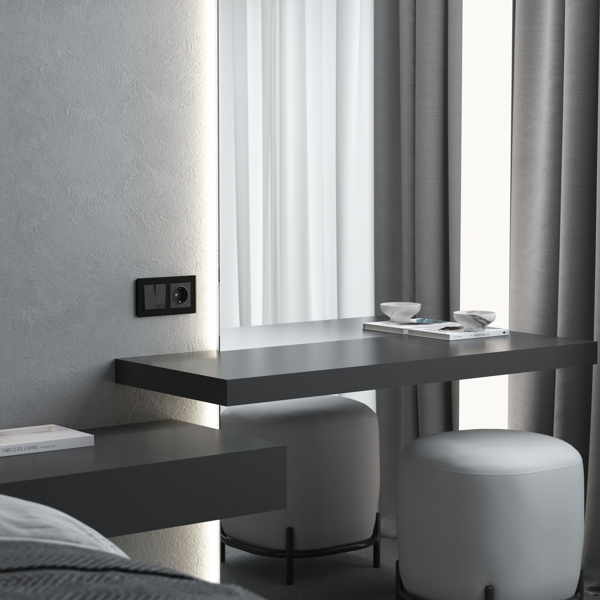 Электроустановочное изделие монтируется в установочную коробку, оставляя видимым только внешнюю лицевую панель и накладную рамку. Механизм для скрытой установки оснащен суппортом из нержавеющей стали, позволяющий крепко зафиксировать изделие в подрозетнике. Надежные контакты из фосфористой бронзы и серебра выдерживают большую нагрузку и обладают большим эксплуатационным ресурсом 40 000 циклов.